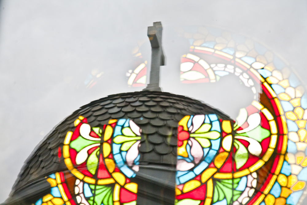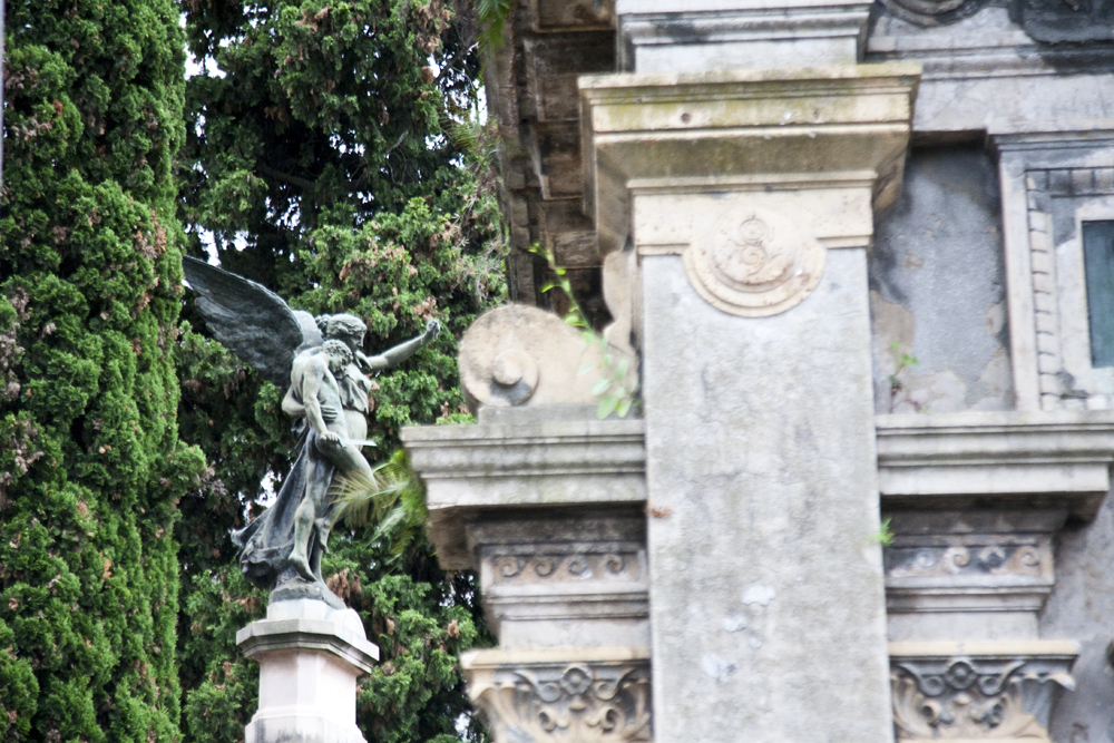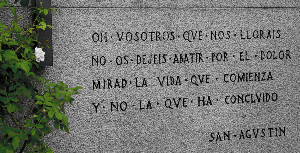 En el frente, sobre las columnas, se inscriben los primeros símbolos de la vida y de la muerte, representados en once alegorías: El huso y las tijeras: el hilo de la vida que se puede cortar en cualquier momento. La cruz y la letra P: la paz de Cristo en los cementerios. La corona: voto de recuerdo permanente. La esfera y las alas: el proceso de la vida y de la muerte que gira incesantemente como la esfera. La cruz y la corona: la muerte y el recuerdo. La abeja: la laboriosidad. La serpiente mordiéndose la cola: el principio y el fin. El manto sobre la urna: el abandono y la muerte. Las antorchas con llamas hacia abajo: la muerte. El búho: el vigilador, y según algunas creencias, anuncia la muerte. El reloj de agua o Clepsidra: el transcurrir del tiempo o el paso de la vida.