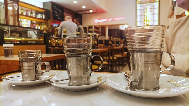 En esa vajilla flamante podrá tomarse el café o el chocolate. O, si el cliente lo prefiere, en los clásicos vasos de vidrio con base y asa de metal. Las viejas tazas blancas con el dibujo de la torre de Giralda estarán exhibidas en la vidriera, junto a los ceniceros labrados con la marca de la vieja ferro-quina Bisleri.