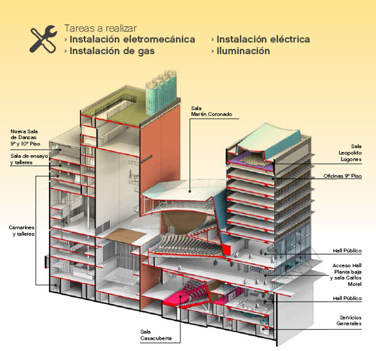 La renovación de instalaciones y actualización Tecnológica del Teatro General San Martin incluye un conjunto de intervenciones interdisciplinarias que mejorarán el funcionamiento del teatro en todos sus aspectos.