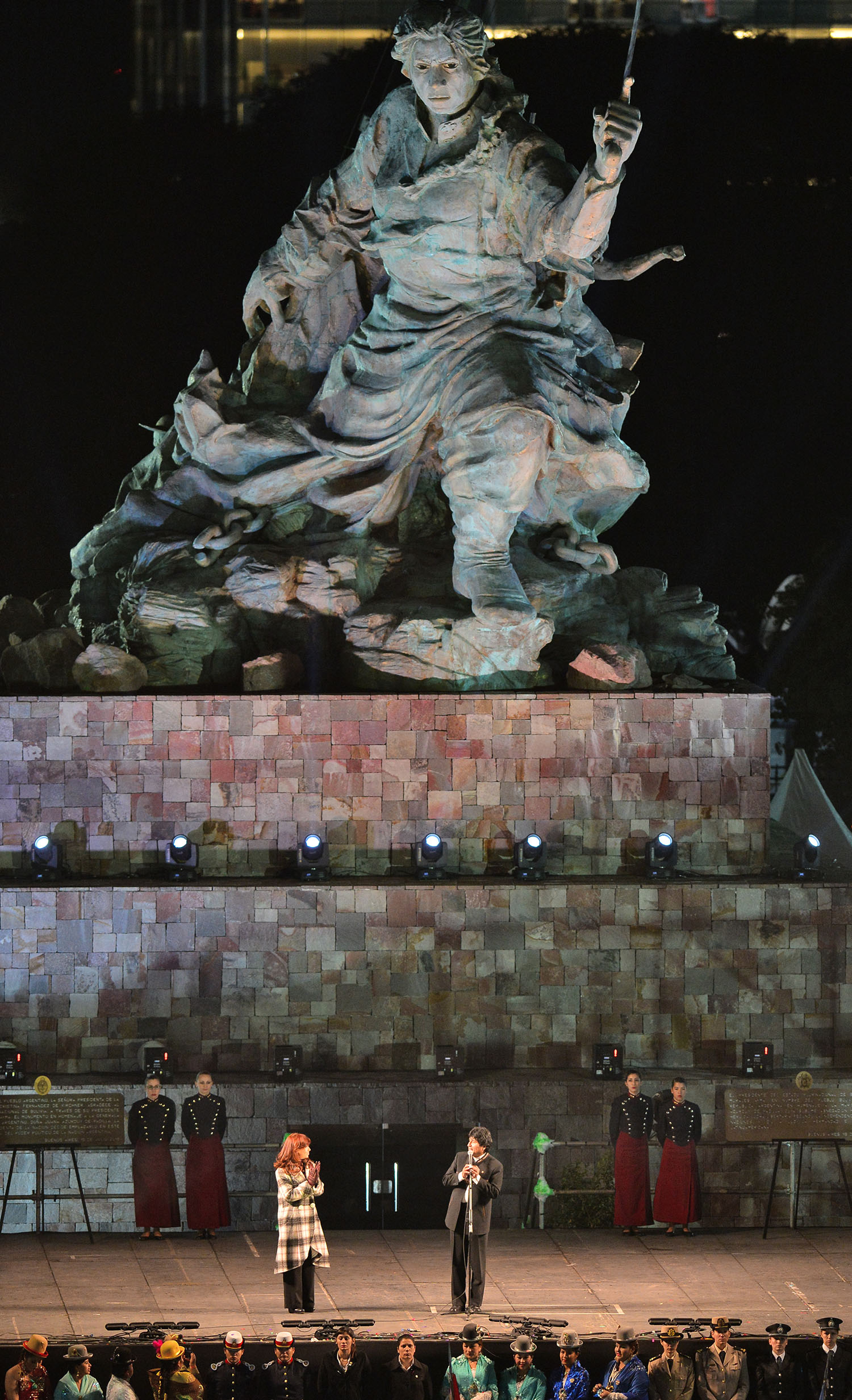 La presidenta Cristina Fernández de Kirchner inauguró este miércoles 15 de julio una estatua en homenaje a Juana Azurduy, en reemplazo del monumento a Cristóbal Colón, reubicado en Costanera Norte tras un acuerdo con el gobierno porteño. CFK compartió el acto con su par boliviano, Evo Morales, quien llegó al país para mantener el “último encuentro bilateral” con la mandataria antes de finalizar su mandato.