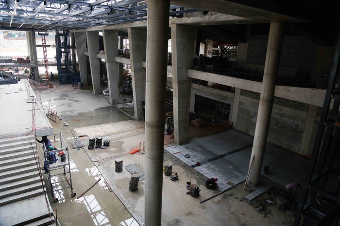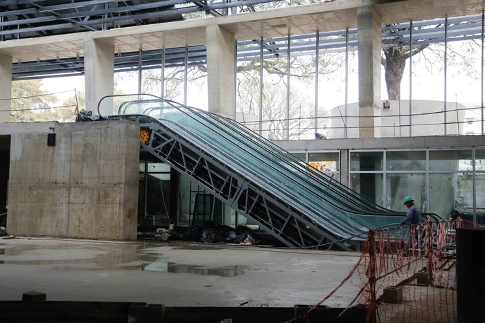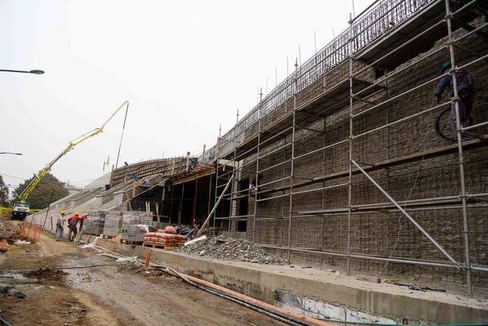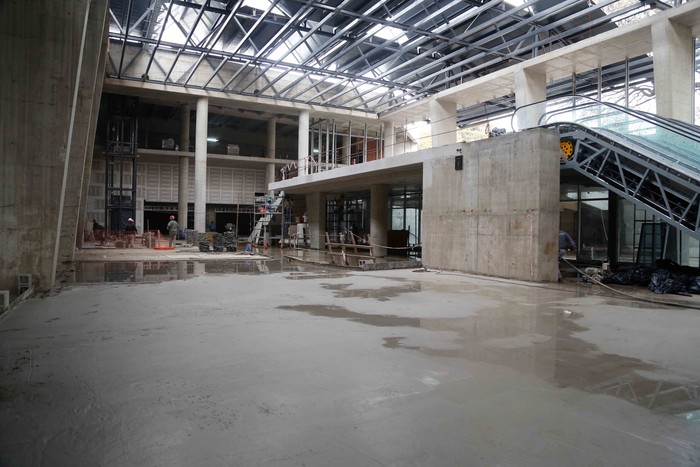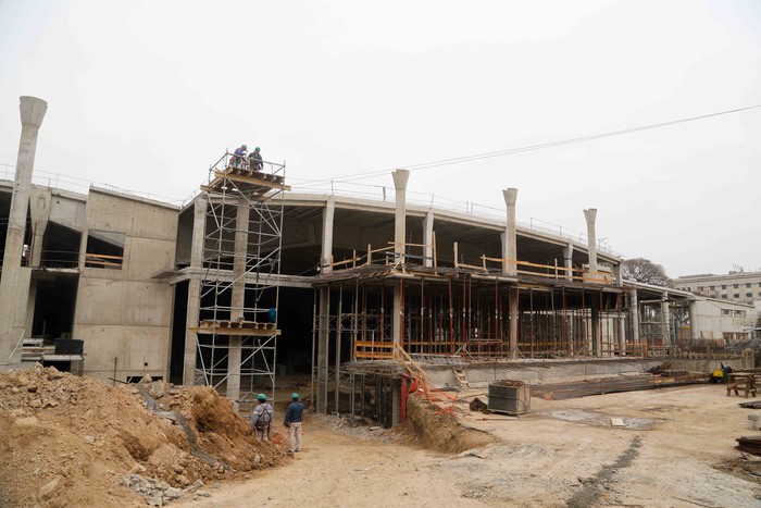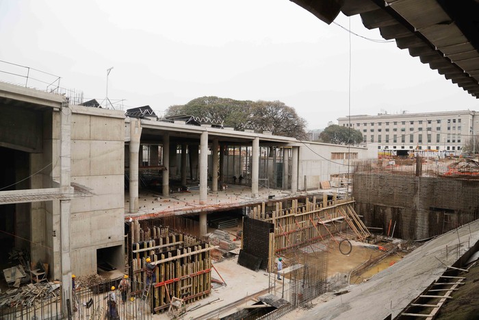 Según las autoridades, el 80% de la estructura de hormigón que conforma el esqueleto principal de la obra ya está terminada y, de hecho, pueden distinguirse a simple vista las dos salas plenarias y el puente de acceso desde la plaza seca, entre otros detalles.